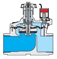 Открытие соленоида высвобождает большой потока из камеры управления. Это приводит к падению накопленного давления в камере управления, что позволяет трубопроводному давлению, действующему на пробку, открыть клапан.